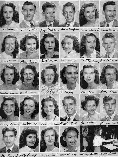 Row 5: Gene Emanuel, Sally Emery, Mary Endacott, Marguerite Eng, Selling tickets in the bank