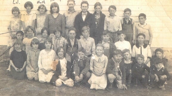Ruby Quinton. The young man in middle of back row in dark jacket is the teacher. This was taken about 1930.