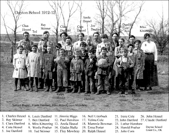 Dayton School, Grant Co., Oklahoma (Double click on the photo for a better view) Dayton was located in the southeast corner of Grant County in the Salt Fork Township. The post office was closed in 1904 and a town no longer exists, but the Dayton "school district" continued. Miss Osie Kittenring is the teacher.