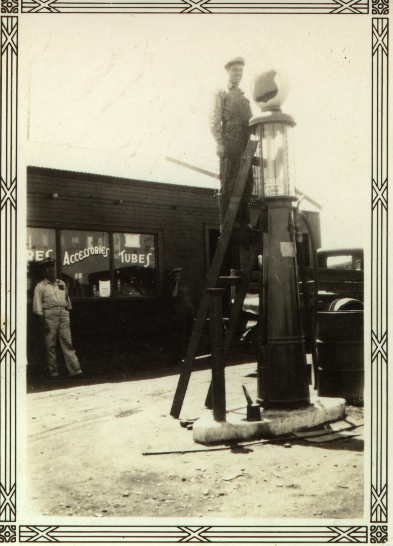 Old Bokoshe Garage and Filling Station Elmer Bowers is standing on the ladder at the pump. Elmer L. Bowers was born in Brazil, Oklahoma in 1911. This Garage and gasoline station was owned and operated by him, his father Bill Bowers and his brother Delmar "Chunky" Bowers for many years. This photo was taken in 1925.