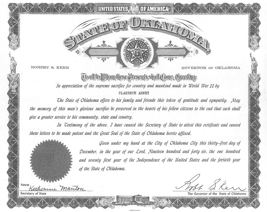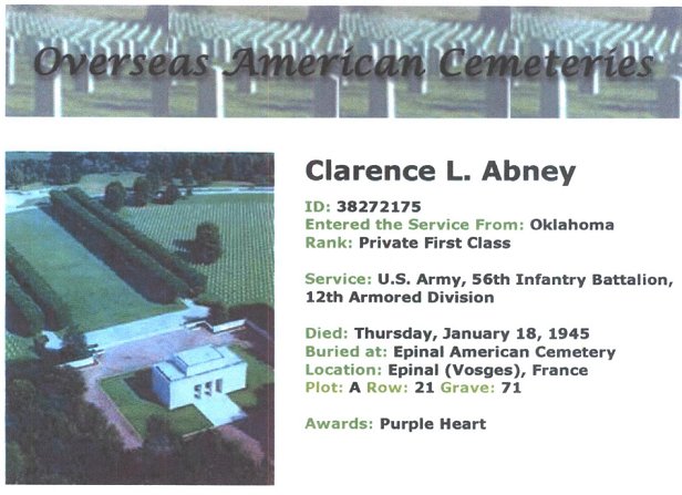 CLARENCE LEON ABNEY was born July 9, 1921, at Stratford, Okla. He graduated from Stratford High School. He began farming out of high school, but WWII had started and he was drafted. He was promoted to Corporal as he was preparing to ship out for overseas. Just prior to going overseas, Clarence married Thelma Motz on Nov. 30, 1943 in Buffalo, New York. Due to a clerical error, Clarence was reverted to PFC in rank after going overseas. His serial number was 38272175. He was assigned to the 12th Armored Division, known as the Hellcats. According to their history, they shipped out of Camp Shanks, New York and sailed for England on 20 September 1944. According to the history of the unit, their battalion engaged in combat on December 5, 1944 near Weislingen. They captured a German town at Utweiler on 21 December 1944. Clarence was killed on 18 January 1945, which was the day his unit engaged in the battle for Herrlisheim, France, a small town north of Strasbourg. Because of their heavy casualties, this became known as "Bloody Herrlishem". Quoting from "The Story of the 12th Armored Division - WWII G.I. Story Book": "This was their only defensive battle of the war when they smacked into a numerically superior and well-entrenched enemy. But while sustaining many casualties, the Hellcats thwarted repeated German attempts to break out of the river head pocket and strike south toward the political prize of Strasbourg. It was here that the 12th was dubbed the "Suicide Division" by the Germans, who eventually withdrew, still puzzled by American tenacity. Later, according to the Nazi POWs, the Hellcats became one of the two most feared divisions on the western Front. The other being the 4th Armored." According to a witness from Stratford, Oklahoma who was also in the invasion, a bomb landed directly in the fox hole where Clarence was, killing him instantly. He is buried in the Epinal American Cemetery, Vosges, France, Plot A, Row 21, Grave 71. However, he also has a marker in the Abney Cemetery, Stratford, Okla. His rank is listed as PFC. He was awarded the Purple Heart. Clarence and Thelma had no children.