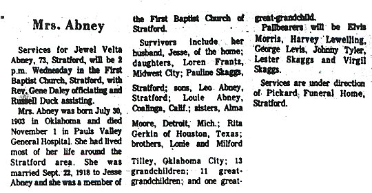 JEWEL VELTA TILLEY was born July 30, 1903. She married Jesse Lee Abney on September 21, 1918. She was a farmer's wife and homemaker all her life. She died of cancer on November 1, 1976.