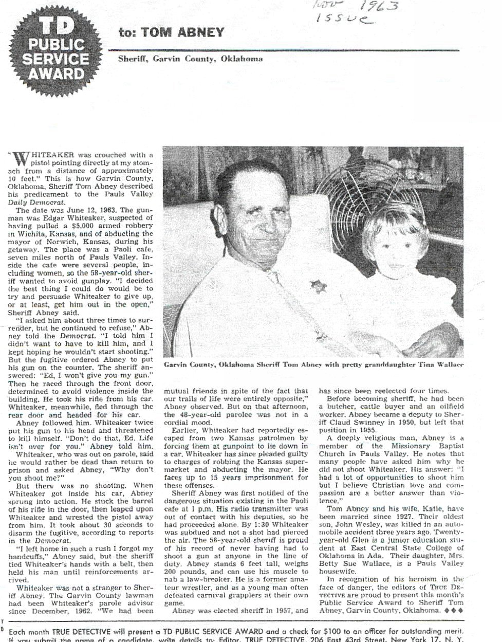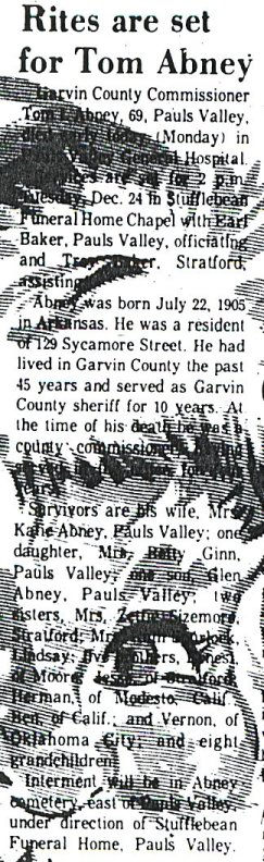 ABNEY THOMAS ISAAC ABNEY was born July 27, 1905 in Franklin County, Arkansas. Tom finished the 8th grade in school, which was typical for young people of his era. He was an amateur wrestler in his younger days. He loved to play checkers and could best almost anyone at the game. As an adult, he was a cattle trader and a butcher. He became Deputy Sheriff under Garvin County Sheriff, Claud Sweeney. He served five years as a deputy and then ran for sheriff and was elected. He served as Garvin County Sheriff for 18 years. During his tenure as sheriff, he received the True Detective Service Award in November 1963, for apprehending an armed fugitive, without injury to anyone. After leaving the Sheriff's Office, he ran for Garvin County Commissioner and was elected. He served in that capacity for two terms. During his time in office, he worked to build a bridge across the Washita River to provide easier access to Pauls Valley to a number of citizens. He never saw it completed, but after his death, the bridge was completed. In recognition of his service to Garvin County, the bridge was named the "Tom Abney Bridge". It is located southeast of Pauls Valley, Oklahoma. After leaving the Commissioner's office, he worked as a tree surgeon and was very active in that occupation until he suffered a heart attack. He was recovering from that when he suffered a stroke that took his life. His services were held in the Stufflebean Funeral Home Chapel of Pauls Valley, with his old friend and his pastor, Earl Storie, officiating. Tom was a faithful member of the Pauls Valley Missionary Baptist Church in Pauls Valley, Oklahoma. He is buried in the Abney Cemetery