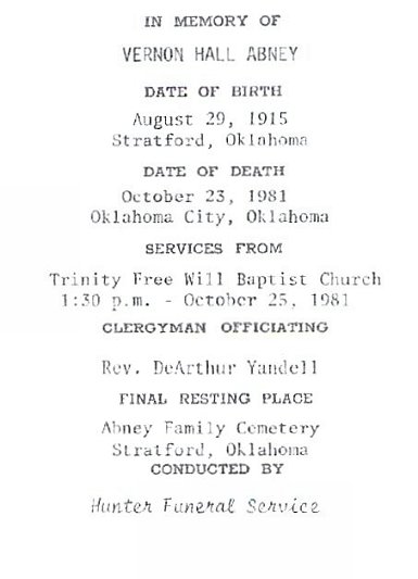 HALL ABNEY VERNON HALL ABNEY was born August 29, 1915 in Stratford, Oklahoma. He was a life long resident of Oklahoma. He married Delma Minnie Mercer on February 14, 1936 in Stratford. His wife, Delma Mercer, was the sister of Katie Mercer, who married Vernon's older brother, Tom Abney. Vernon finished the 8th grade in school. That was typical for his era. He didn't receive any encouragement to go further. Vernon loved to fish and was very successful in that effort. He retired from the Oklahoma City Stockyards. Vernon died in Oklahoma City on October 23, 1981. On the day of his death he had just finished doing yard work for a neighbor and had sat down on the porch to rest. He lay back to relax and died of a heart attack. Vernon's services were held in Trinity Freewill Baptist Church in Oklahoma City, officiated by pastor DeArthur Yandell. Vernon was raised as a Missionary Baptist, but at the time of his death, his membership was with Trinity Freewill Baptist. Vernon is buried in the Abney Cemetery.