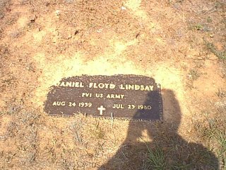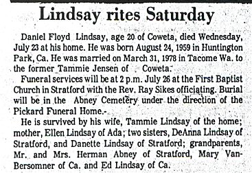DANIEL FLOYD LINDSAY served a short time in the U.S. Army. After separating from the Army, Danny finished high school. On July 23, 1980, he died of a gunshot wound at this home in Coweta, Oklahoma. Although there were suspicious circumstances to indicate otherwise, his death was officially listed as self-inflicted. His services were officiated by Pastor Sykes, First Baptist Church, Stratford, Okla., under the direction of Pickard Funeral Home. Danny married Tammie Jensen of Coweta on March 31, 1978 in Tacoma, Washington. They had no children.