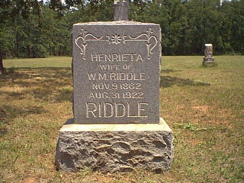with Robert L. Riddle's spire standing back behind them under the tree. Janie Riddle's stone can be partially seen behind and between William & Henrieta. |