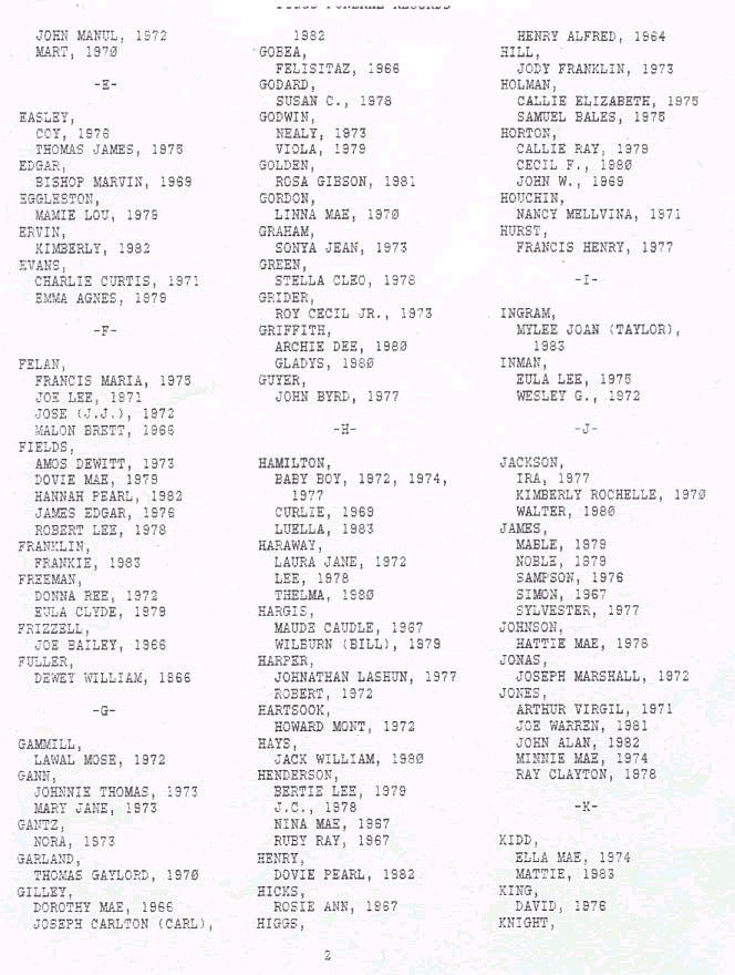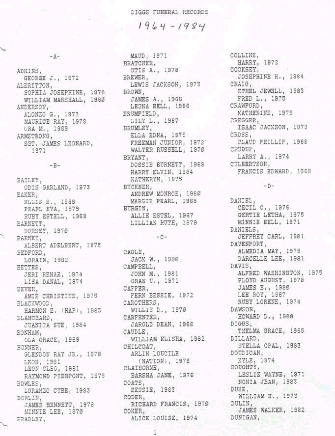 Bob Diggs Funeral Home Records Index 1964 - 1984