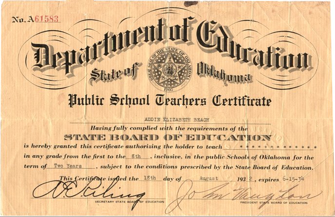 In later years I went back to school and finished high school and 3 years of college, before retiring. In those days all one had to do was to pass the Co. Exam to be allowed to teach.