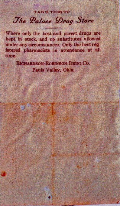 This is a hand written prescription with Dr. A.J. Robinson's signature. The picture to the right is the back of this prescription. I found a Dr. Andrew J. Robinson prescription which contains his signature, but there is no date. The title on the prescription is "The Palace Drug Store Richardson-Robinson Drug Co. Pauls Valley, Okla." On the top it reads office of Dr. A. J. Robinson, phone 97, Pauls Valley, Okla. I have asked a pharmacist to tell me what the medicine is and what it was for. He has done his best but there is one ingredient that he could not find so he was not very sure of what it was. We think the prescription was for my grandfather, my brother (a child), or my uncle. My brother died in August 1914 and my uncle in September 1914 and my grandfather died in 1915. My grandfather had TB, my uncle Typhoid Fever and we are not sure about my brother, he was sick quite a while before he died. He may have had some sort of fever. They all lived close to one another. Submitted by Dorothy J. Smith |