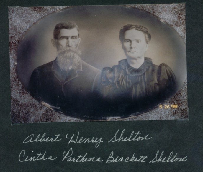 Albert Henry Shelton was born 6 July, 1844 in Sebree, Webster Co. KY. - died 9 May, 1924 in Stratford, Garvin Co. OK. He was a Civil War Veteran serving as a corporal with Company C. 35th KY. Infantry. He married Cyntha Parthena Brackett 26 October, 1865 in Webster Co. KY. She was born 4 Sept., 1844 - d 27Nov. 1924 in Stratford, Garvin Co. OKlahoma