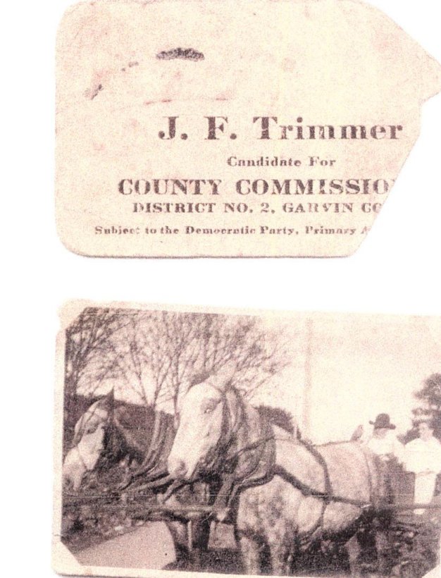 To compare the 2 pictures: The round window is the front door and the screen door has been opened to the right. This is James Fount Trimmer, Jessie Franklin Trimmer, and his 2nd wife Celia Elizabeth Carter Hufft Trimmer.He married the 2nd wife in 1910 and he died in 1914, so the picture dates during those years. Jessie Franklin Trimmer was the first County Commissioner for Garvin County.