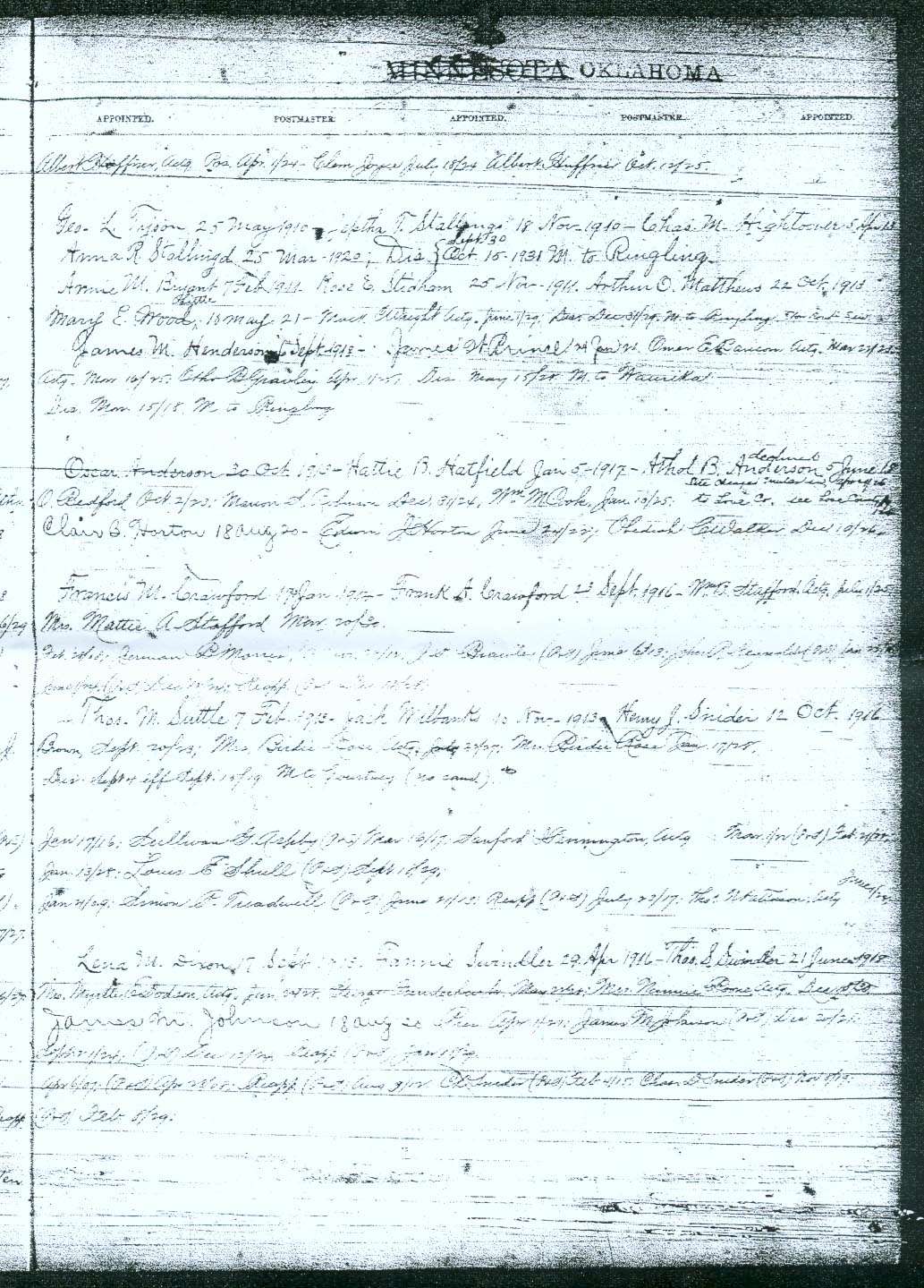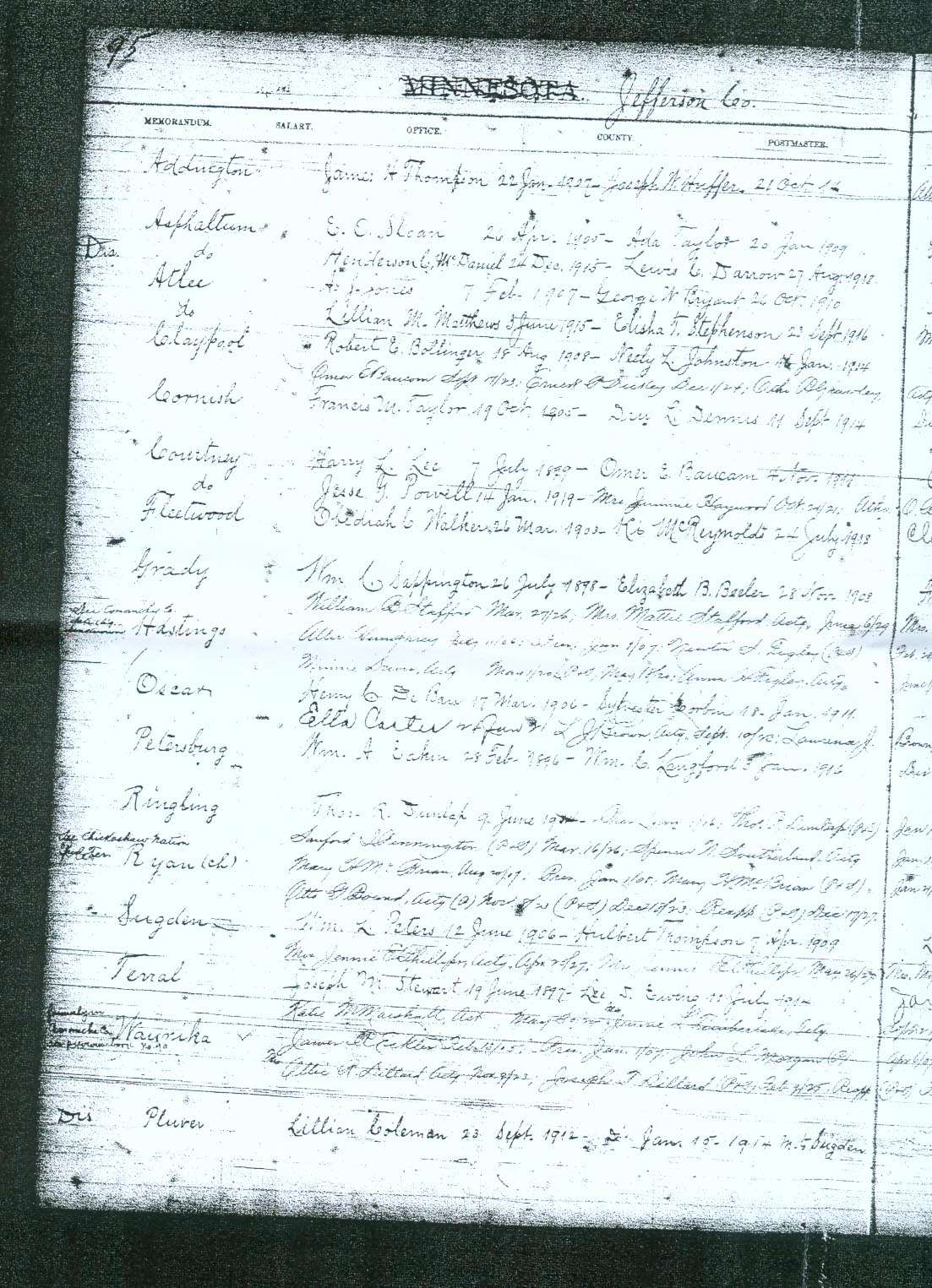 Co. Oklahoma photos lists early 1900's postmasters of various Jefferson Co. OK towns the following list of P. O.'s from Geographic Names Information System |
