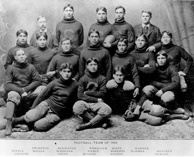 1899 Football Team photo of the Carlisle Indian football team, who were going to play the Cal Berkeley in California in 1899. Sorry about the quality of the photo, it is on newsprint paper from the San Francisco Examiner newspaper. That’s Pop Warner, in the back row, far right