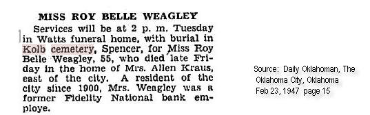 You found this information at //www.okgenweb.net/~okoklaho/obits2012/weagley_miss_roy_belle.htm |