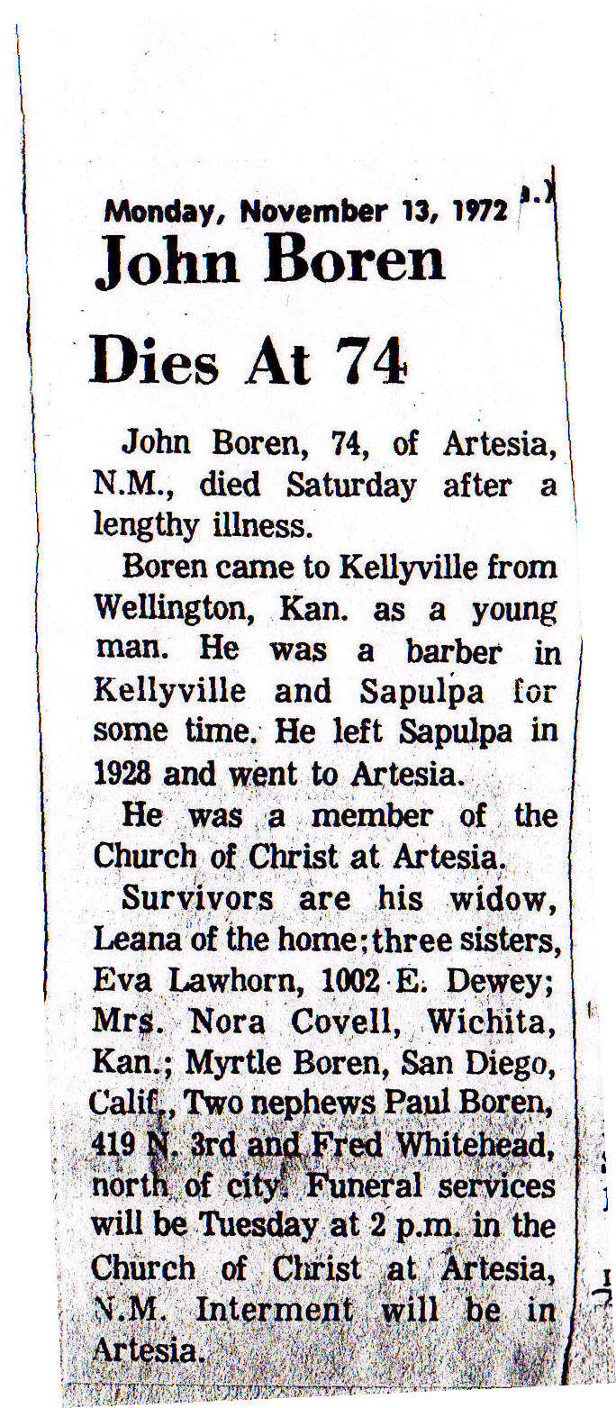 November 13, 1972John Boren, 74, of Artesia, NM died Saturday after a lengthy illness.