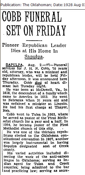 SAPULPA. Aug. 2.—Funeral service for J. H. N. Cobb, 70 year old
