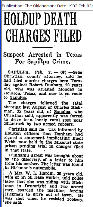 shot and killed Charles Hickman, 34, Sapulpa, near here last