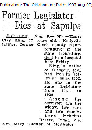 SAPULPA Aug. 6.- (AP) —Henry Clay King. 77 years old.
