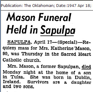 Mrs. Mason, a former Sapulpan, died Monday night at the home of a son in Tulsa. She was born in Dublin, Ireland. Survivors are a daughter and two sons.