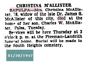 SAPULPA—Mrs. Christina McAllister, 78, widow of the late Dr. James B. McAlister of this city, died at the home of her son. Charles W. McAllister. Tulsa, Tuesday.