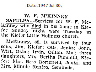 McKinney, 85, is survived by four sons. Jim, Kiefer: Otis, Jenks: John, Wirt, Okla.; Irvin, Oilton. Mo.: thre4 daughters, Mrs. Bertha Pummill, Kiefer; Mrs. Bess Bortzfield, Jenks, and Mrs. Minnie Renfro, Seminole.