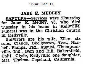 Kellyville; one daughter, Mrs. Thelma Copeland, California.