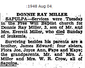 SAPULPA--Services were Tuesday in the. Free Will Baptist church for Donnie Ray Miller, 3, son of Mr. and Mrs. Everett Miller, who died Sunday of leukemia.