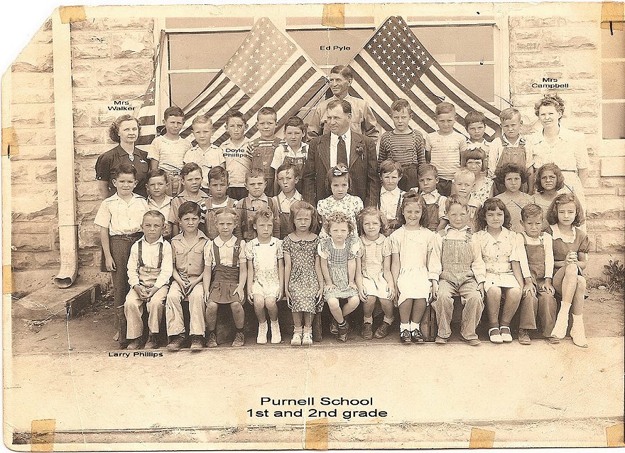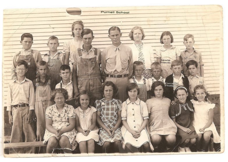 If I knew the name of the school or person in them them I added it to the picture. I am not too sure of the dates but I can tell you Dorthy was born in 1919, Larry was born in 1937, Doyle and Kenneth was born between 1930 and 1936 so that can help you estimate the age of the pictures. My father is Larry Phillips and he is in a couple of these picture the rest are his brothers and sister and there is a sister in law in there too.