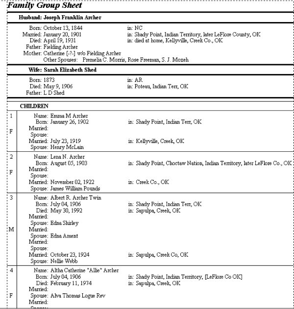 Joseph Franklin Archer wife 1) Premelia (Amelia) Morris wife 2) Rose Freeman wife 3) Sarah Elizabeth Shed Researcher: Marti