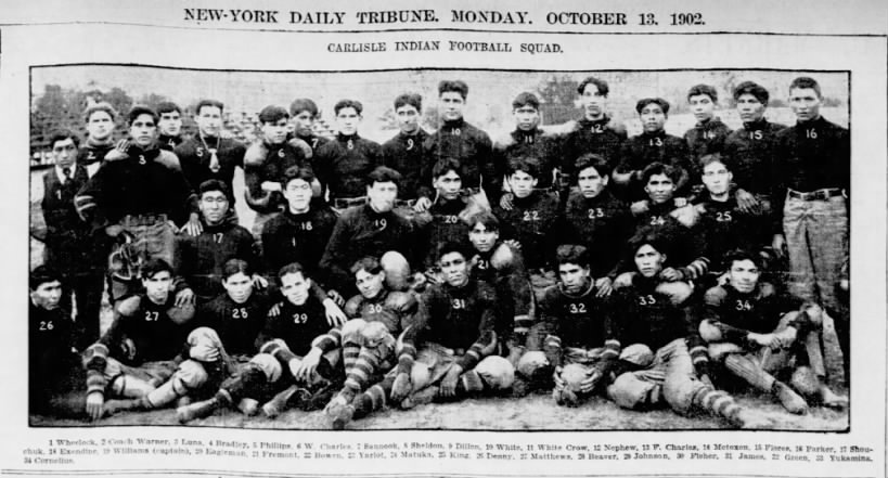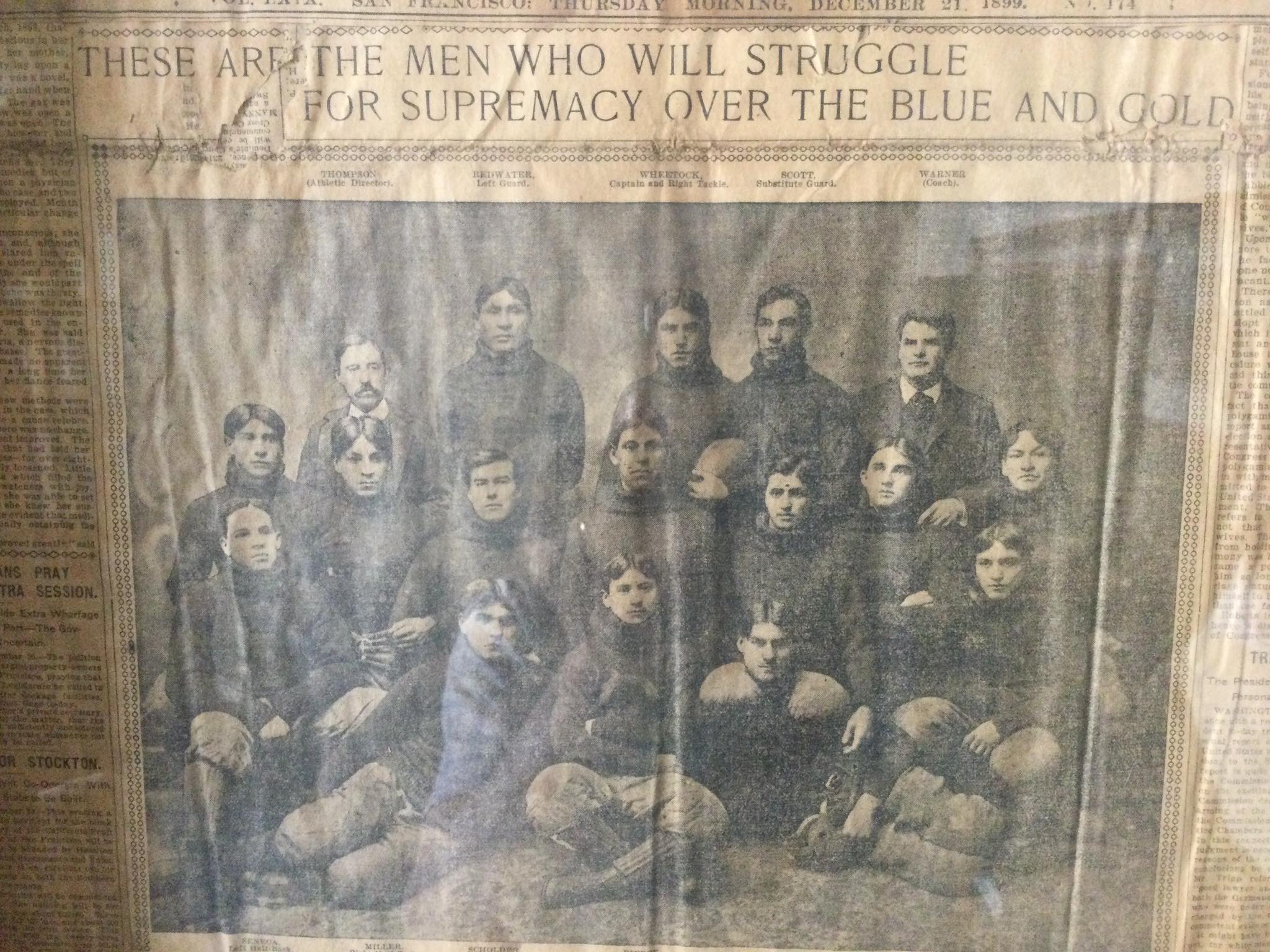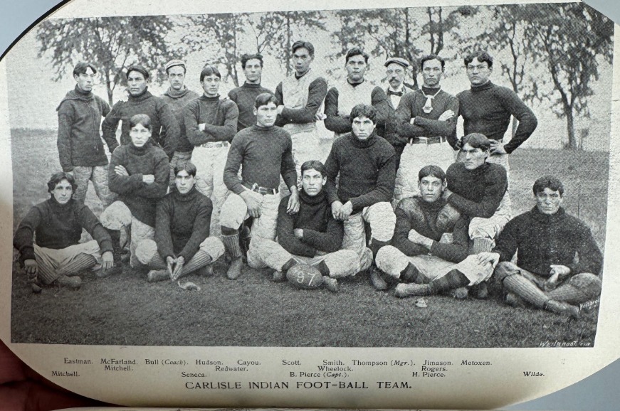 1899 Football Team photo of the Carlisle Indian football team, who were going to play the Cal Berkeley in California in 1899. Sorry about the quality of the photo, it is on newsprint paper from the San Francisco Examiner newspaper. That’s Pop Warner, in the back row, far right