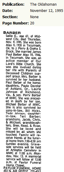 1928 in Tecumseh, Ok. to J. Perry & Orpha S. Brock. She