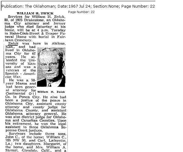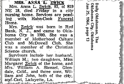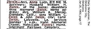 Zwick b: December 23, 1905 in Oklahoma City, OK d: