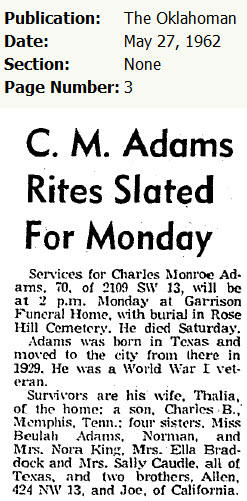 Services for Charles Monroe Adams, 70, of 2109 SW I3, will be at