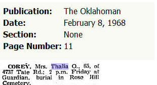Mrs. Thalia O. Corey, 65, of 4737 Tate Rd; 2 pm Friday at