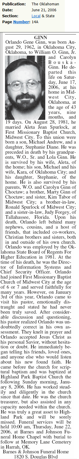 Orlando Gene Ginn was born Aug. 29, 1962 in Oklahoma City to
