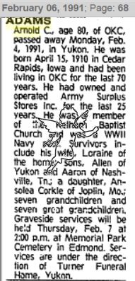 December 30, 1993 ADAMS Arnold C, age 80, of OKC, passed away Monday,