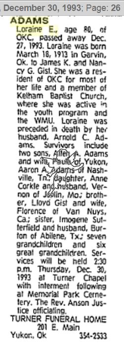 December 30, 1993 ADAMS _Loraine E, age 80,