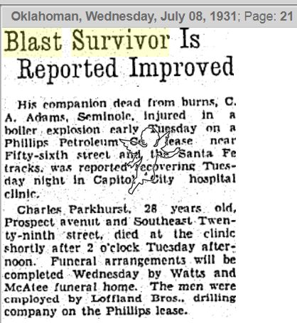 C. A. Adams, Seminole, Injured in a boiler explosion early