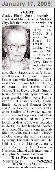 You found this information at //www.okgenweb.net/~okoklaho/obits2017/smoot_archie_gladys.htm | ||